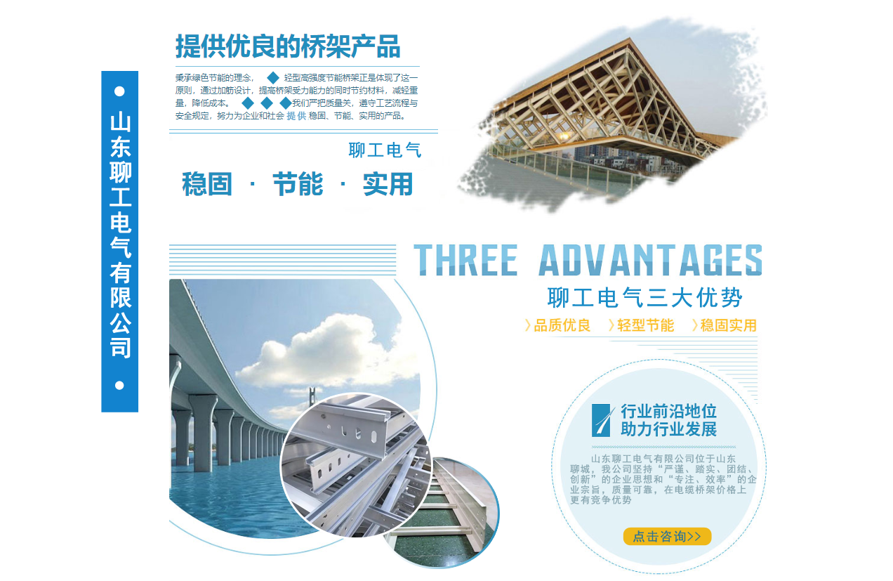山東聊工電氣有限公司位于山東聊城,是一家銷售各類橋架的公司,公司主營鍍鋅防火噴塑橋架,鍍鋅防火電纜橋架 ,不銹鋼電纜橋架,熱浸鋅電纜橋架,鋁合金電纜橋架,熱鍍鋅電纜橋架,梯式電纜橋架等我公司堅持“嚴謹、踏實、團結、創(chuàng)新”的企業思想和“專注、效率”的企業宗旨,質量可靠,在電纜橋架價格上更有競爭優(yōu)勢。公司追求品質,配有研發(fā)人員,進行產品的改革和創(chuàng)新,服務先進走出了一條富有企業特色的可持續(xù)化發(fā)展之路! 我公司鄭重向你承諾:保證最好的質量,以低的價格,完善的售后服務,來答謝新老客戶??商崆半娫捖撓?。...